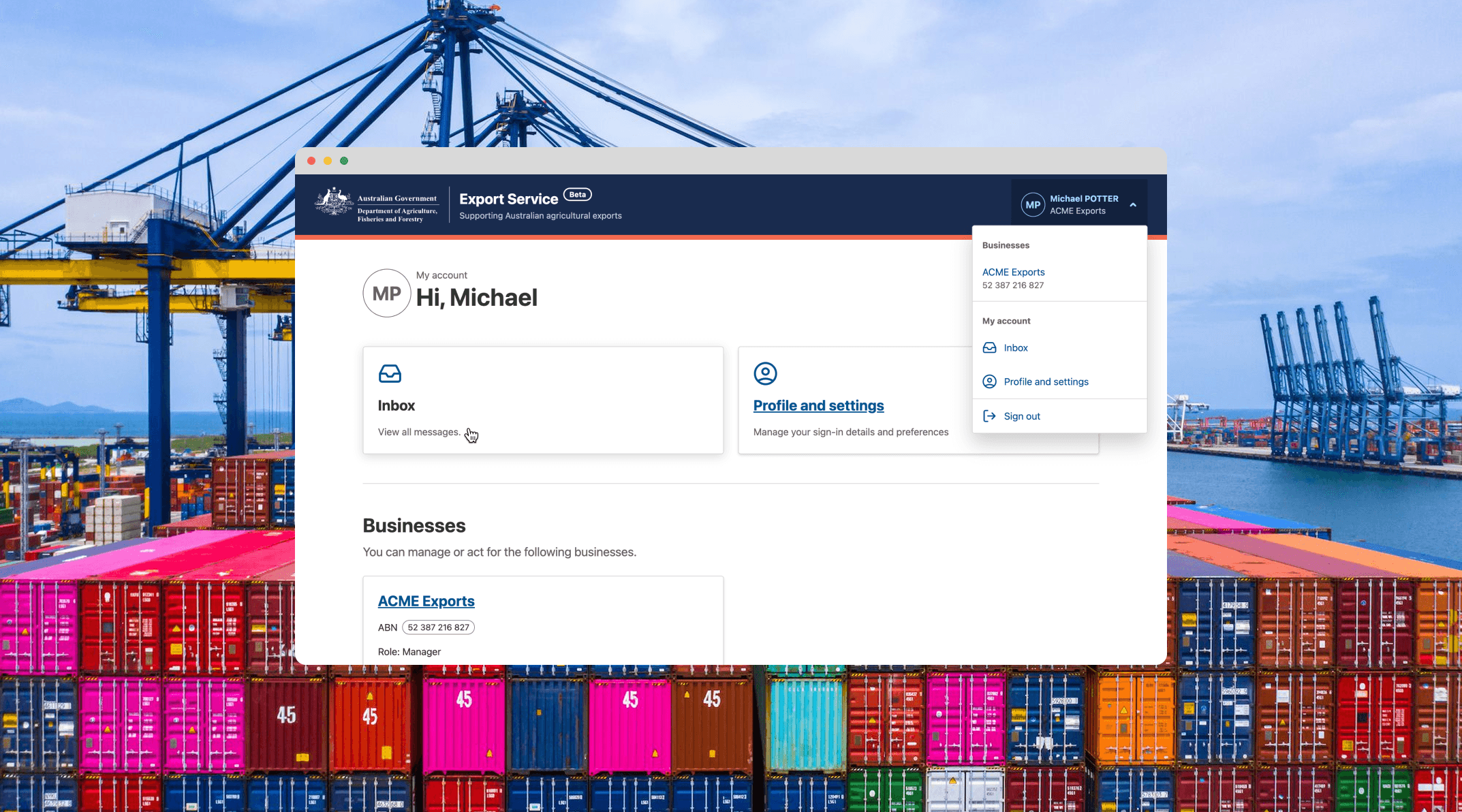 Account and access platform for Australia's export industry. I led end-to-end design serving 2,000+ regulated businesses, reducing registration times and simplifying compliance.